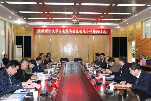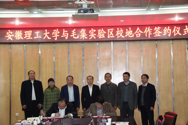淮南市科技局计划科,毛集实验区工委办、管委办、科技局、招商局、经开区等单位负责人以及部分企业代表和我校党政办公室、科技产业处、毕业生就业工作处、地球与环境学院负责人参加了签约仪式。