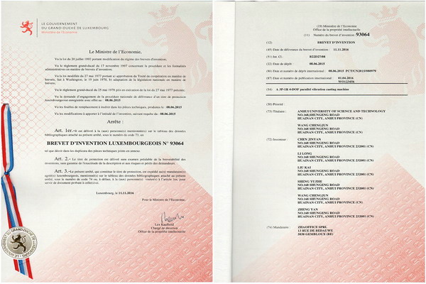 该发明专利以2015年8月的中国发明专利为优先权向国际专利局申请PCT专利,获得国际专利局发出的具有“新颖性、先进性和工业实用性”的国际阶段审查结论;继而于2016年5月通过中欧专利代理机构进入申请卢森堡国家阶段,并于近日获得授权(授权日:2016年11月11日)。